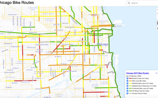 Chicago Bike Routes combines street bike lane data from the city’s Department of Transportation, and routes highlighted in the Chicago Reader’s and Streetsblog Chi’s Mellow Bike Routes. Similar to Chicago’s L system, different colors mark different routes — Chicago’s 44 miles of shared, car-bike lanes are marked in red, 88 miles of individual bike lanes are orange, and 107 miles of buffered bike lanes are yellow. Esling said he spent just a few nights after work creating the app through Mapbox, an open-source mapping platform.